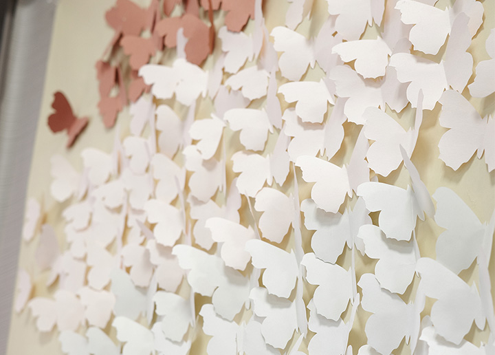 三気堂薬局に入ると、季節の移ろいを感じるディスプレイ装飾が出迎えてくれます。緻密な切り絵や手の込んだフェルト手芸など、どれもスタッフが趣向を凝らして製作したもので、訪れる患者さまたちの心を和ませています。